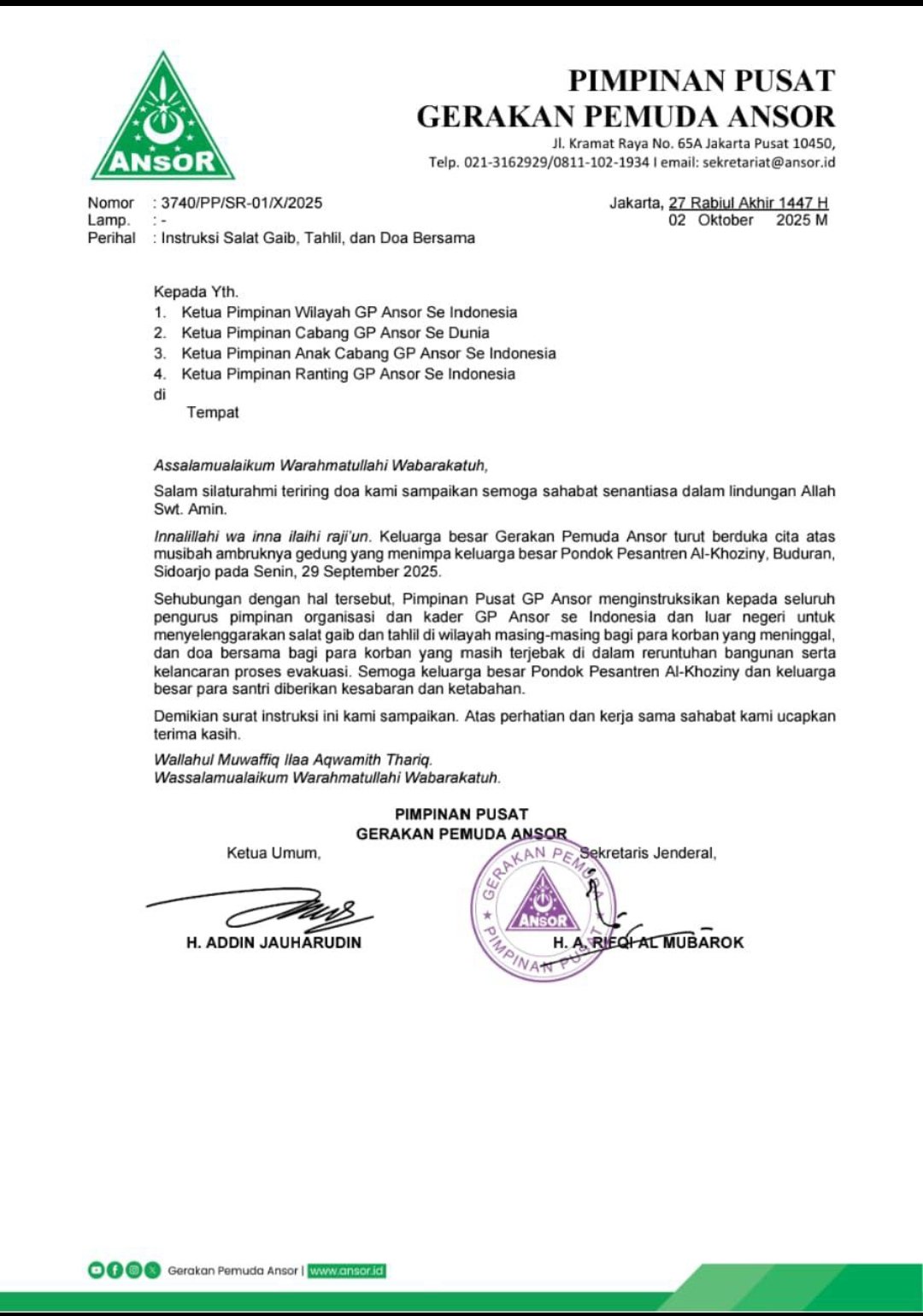 Instruksi tersebut tertera dalam Surat Nomor 3740/PP/SR/-01/X/2025 Perihal Instruksi Salat Gaib, Tahlil, dan Doa Bersama yang ditandatangani oleh Ketua Umum beserta Sekretaris Jenderal Pimpinanan Pusat GP Ansor tertanggal 2 Oktober 2025.